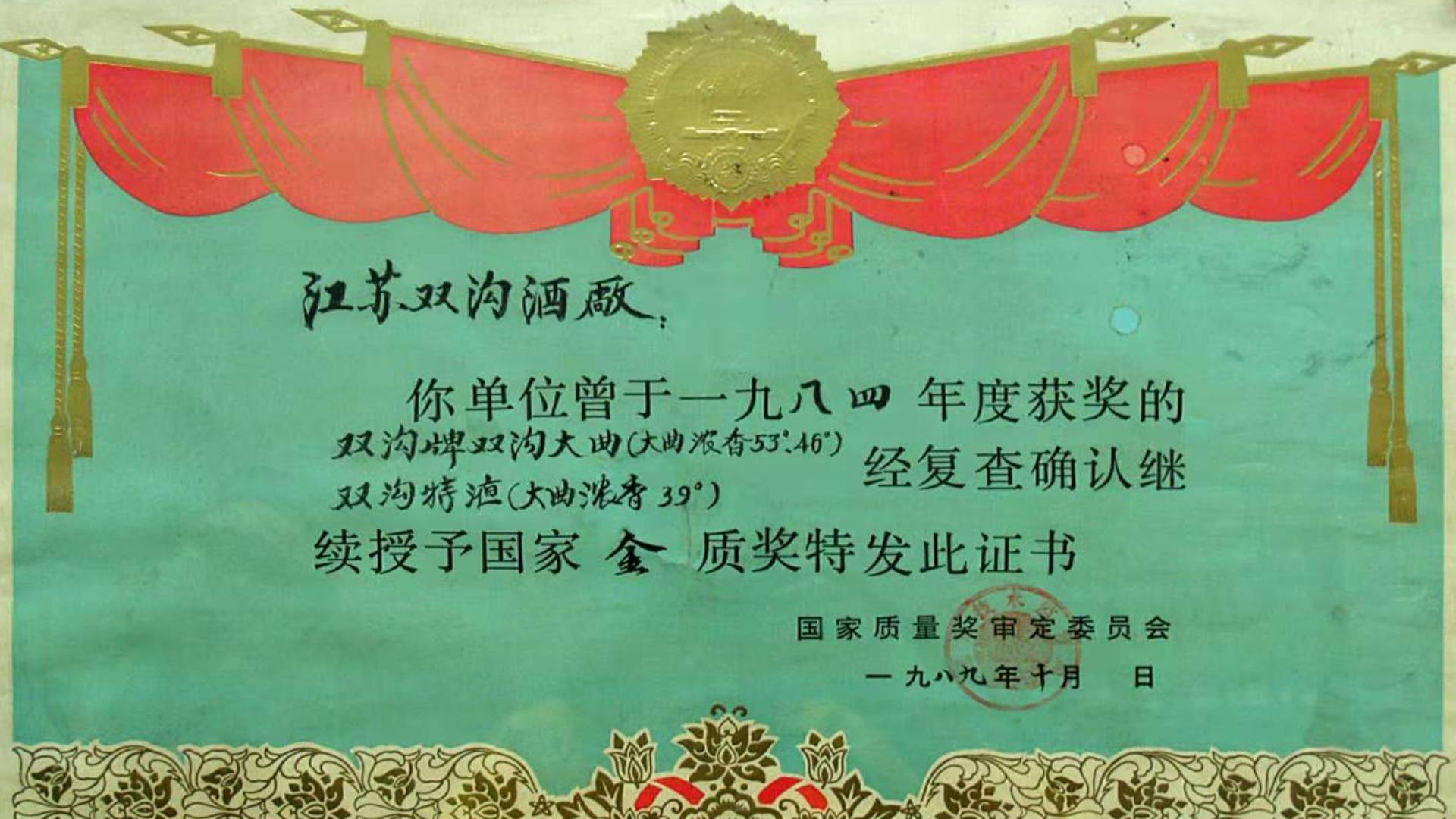 1984年,雙溝大曲獲國(guó)家金質(zhì)獎(jiǎng)